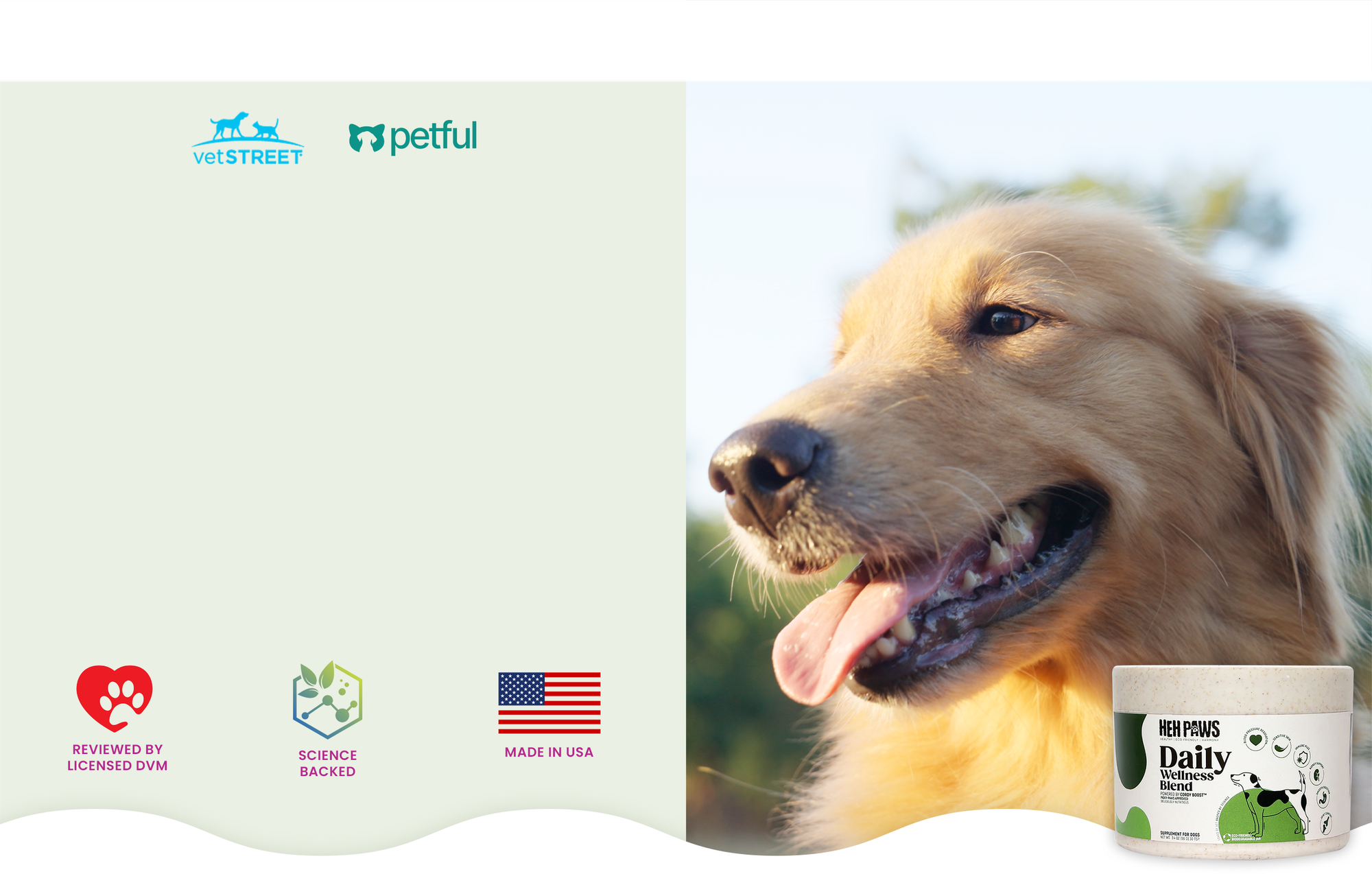 (Pronounced “Hey! Paws”) We’re a family-run team of scientists who care about dogs like they’re part of the family. Most supplements are filled with generic powders and hidden fillers. We wanted something better — so we created HEH PAWS: Daily Wellness Blend. A clean filler-free,vet-tested formula made with real ingredients and backed by research. Our mission resonated — we were fully funded in just 2 hours on Kickstarter, a global platform where people back products they believe in, and honored as a Project We Love.
